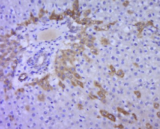 多聚甲醛固定,石蜡包埋(大鼠肝组织);用柠檬酸钠缓冲液(pH6.0)煮沸15min后获得抗原;用3%过氧化氢阻断内源性过氧化物酶20分钟;在37℃下封闭缓冲液(正常山羊血清)30min;抗体(ABP)多克隆抗体在1:400过量下孵育。在4°C下进行光照,然后进行共轭二次20分钟,并进行DAB染色。