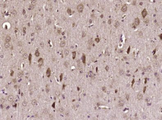 多聚甲醛固定,石蜡包埋(大鼠脑);经柠檬酸钠缓冲液(pH6.0)煮沸15min后获得抗原;用3%过氧化氢阻断内源性过氧化物酶20分钟;阻断缓冲液(正常山羊血清)在37℃下30min;用(磷酸-ATF2(Ser322))多克隆抗体进行抗体孵育。在4°C下1:500过夜,然后用共轭二次进行20分钟的DAB染色。