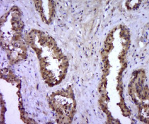 多聚甲醛固定,石蜡包埋(人前列腺组织);用柠檬酸钠缓冲液(pH6.0)煮沸15min后获得抗原;用3%过氧化氢阻断内源过氧化物酶20分钟;阻断缓冲液(正常山羊血清)37℃30min;用(BRCA1)抗体孵育。Ser1466))多克隆抗体,未结合于1:400于4℃下过夜,随后经共轭二级20分钟和DAB染色。
