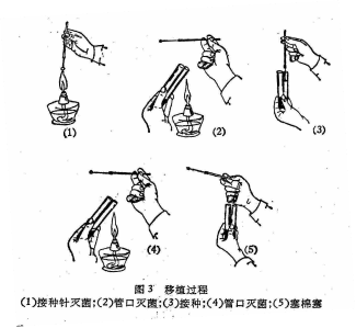 真菌转接需使用的接种工具为接种钩、铲,其样式大小见图1。制造的金属可用铂丝或镍丝,也可使用电炉丝,原则是软硬度适当,能经受反复火焰烧红。接种真菌的接种钩、铲,其丝的直径以1毫米比较适合。步骤:右手执针(铲、钩等),左手执管,烧针灭菌,拔塞烧口,挑菌移植,烧口塞管,烧针灭菌等,可参照图3。